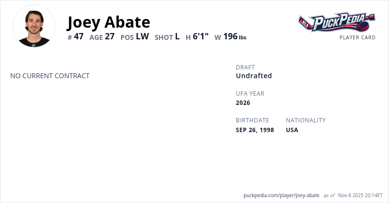 Joey Abate is an Unrestricted Free Agent (No Qualifying Offer). His last contract was 1 year, $775,000 with a cap hit of $775,000 per season. It expired at the end of the 2023-24 season.