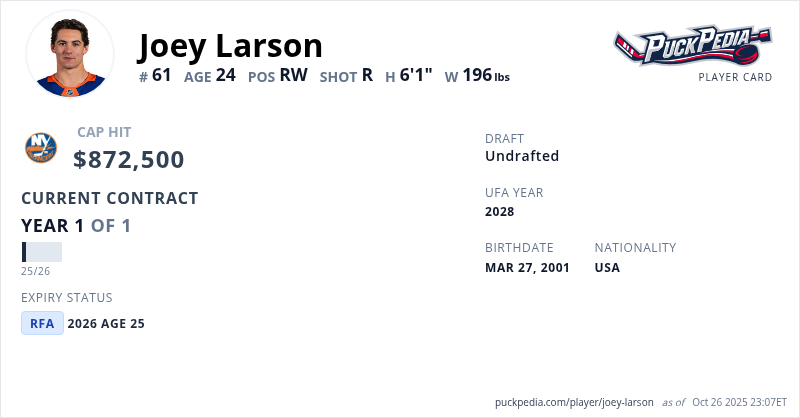 Joey Larson is signed to a 1 year, $872,500 contract with a cap hit of $872,500 per season, playing for the New York Islanders. His contract expires at the end of the 2025-26 season, making Larson a Restricted Free Agent.