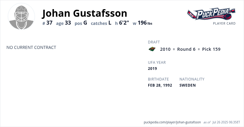 Johan Gustafsson is a Restricted Free Agent. His last contract was 3 years, $1,995,000 with a cap hit of $665,000 per season. It expired at the end of the 2014-15 season.