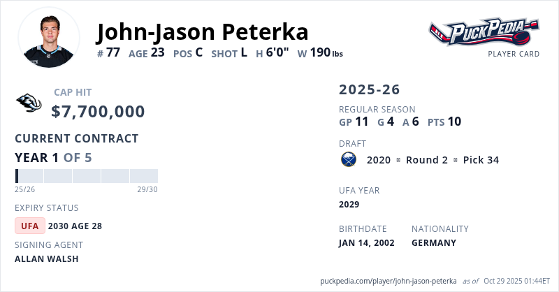 John-Jason Peterka is signed to a 5 year, $38,500,000 contract with a cap hit of $7,700,000 per season, playing for the Utah Mammoth. His contract expires at the end of the 2029-30 season, making Peterka an Unrestricted Free Agent.