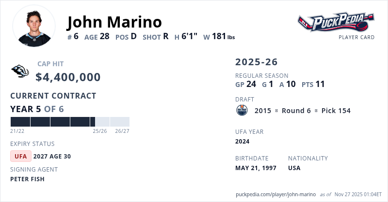 John Marino is signed to a 6 year, $26,400,000 contract with a cap hit of $4,400,000 per season, playing for the Utah Mammoth. His contract expires at the end of the 2026-27 season, making Marino an Unrestricted Free Agent.