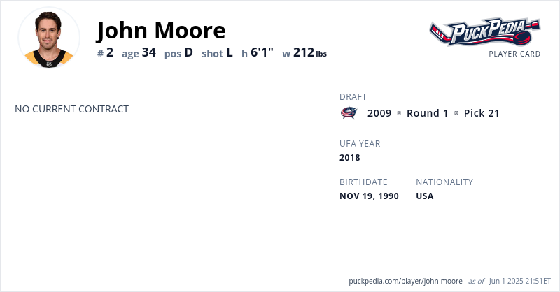 John Moore is an Unrestricted Free Agent. His last contract was 5 years, $13,750,000 with a cap hit of $2,750,000 per season. It expired at the end of the 2022-23 season.