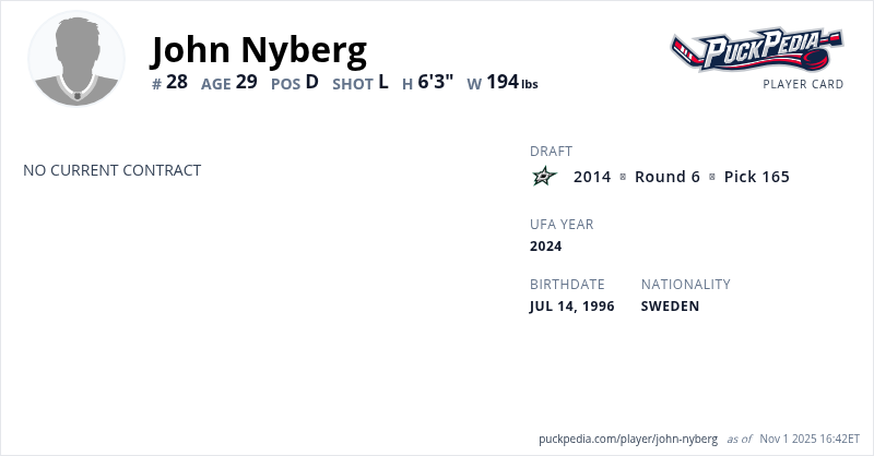 John Nyberg is an Unrestricted Free Agent (No Qualifying Offer). His last contract was 3 years, $2,235,000 with a cap hit of $745,000 per season. It expired at the end of the 2019-20 season.