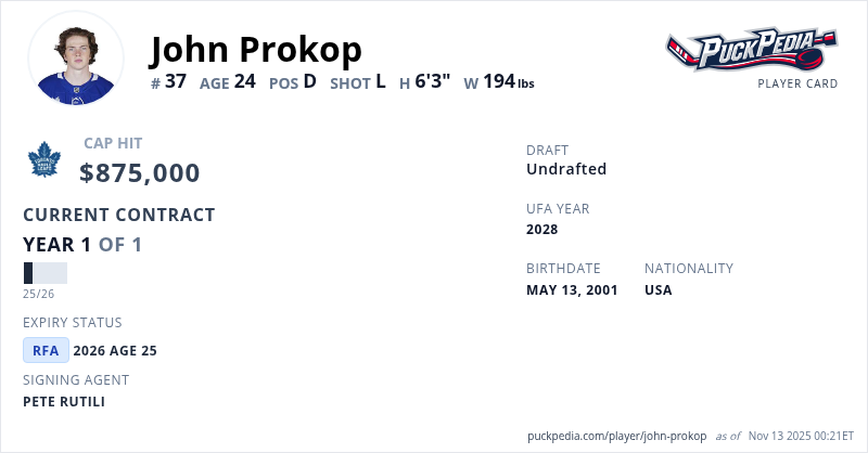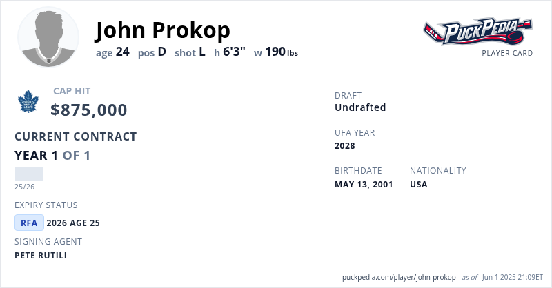 John Prokop is signed to a 1 year, $875,000 contract with a cap hit of $875,000 per season, playing for the Toronto Maple Leafs. His contract expires at the end of the 2025-26 season, making Prokop a Restricted Free Agent.