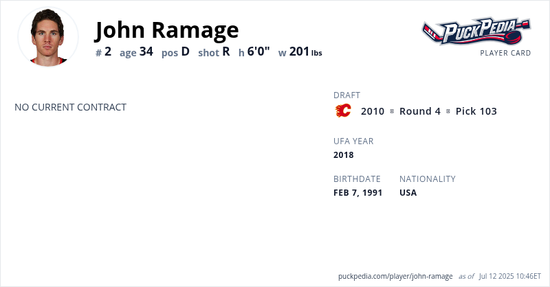 John Ramage is an Unrestricted Free Agent. His last contract was 1 year, $650,000 with a cap hit of $650,000 per season. It expired at the end of the 2018-19 season.