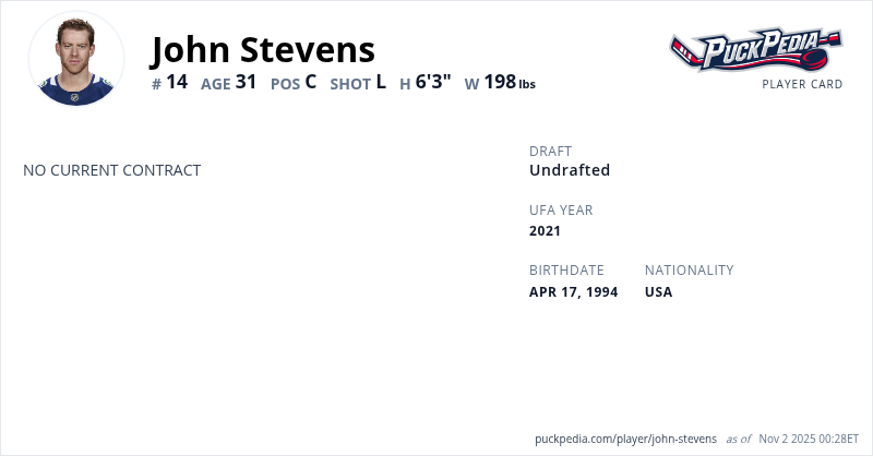 John Stevens is an Unrestricted Free Agent. His last contract was 1 year, $750,000 with a cap hit of $750,000 per season. It expired at the end of the 2022-23 season.