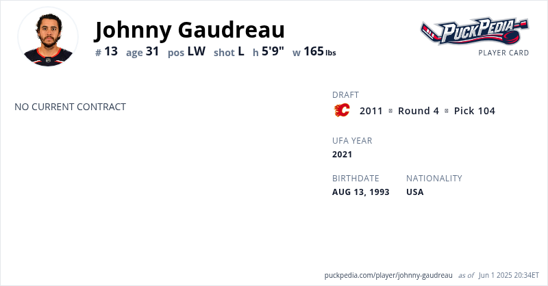 Johnny Gaudreau is an Unrestricted Free Agent. His last contract was 7 years, $68,250,000 with a cap hit of $9,750,000 per season.