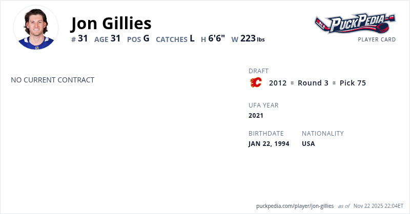 Jon Gillies is an Unrestricted Free Agent. His last contract was 1 year, $750,000 with a cap hit of $750,000 per season. It expired at the end of the 2022-23 season.