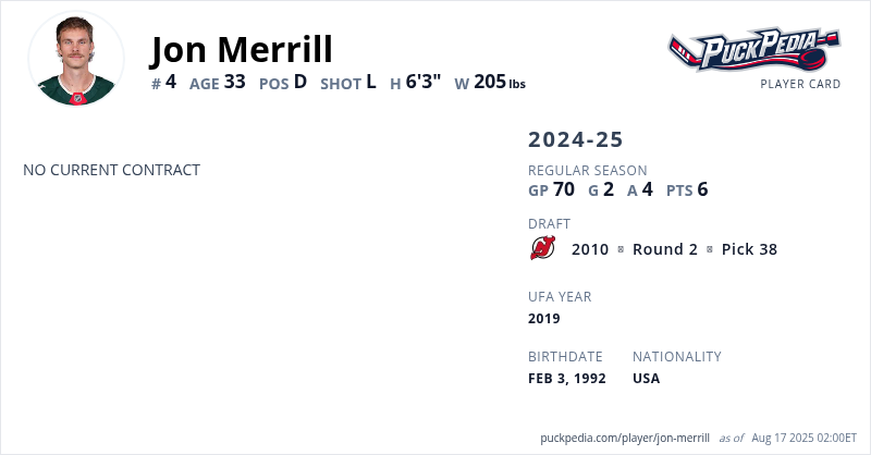 Jon Merrill is an Unrestricted Free Agent. His last contract was 3 years, $3,600,000 with a cap hit of $1,200,000 per season. It expired at the end of the 2024-25 season.