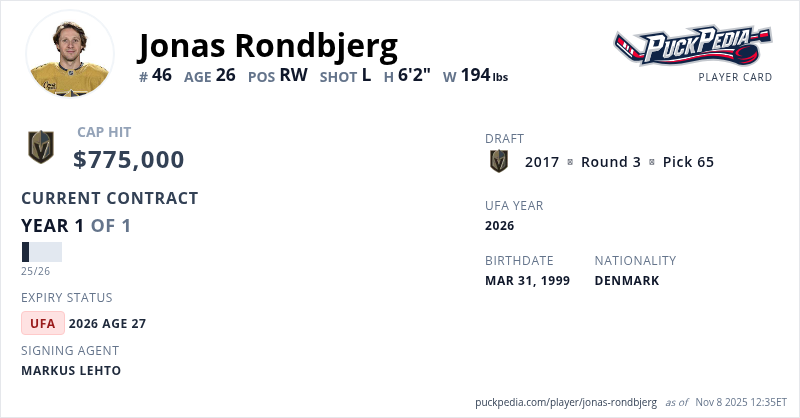 Jonas Rondbjerg is signed to a 1 year, $775,000 contract with a cap hit of $775,000 per season, playing for the Vegas Golden Knights. His contract expires at the end of the 2025-26 season, making Rondbjerg an Unrestricted Free Agent.
