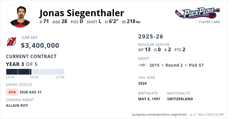 Jonas Siegenthaler is signed to a 5 year, $17,000,000 contract with a cap hit of $3,400,000 per season, playing for the New Jersey Devils. His contract expires at the end of the 2027-28 season, making Siegenthaler an Unrestricted Free Agent.