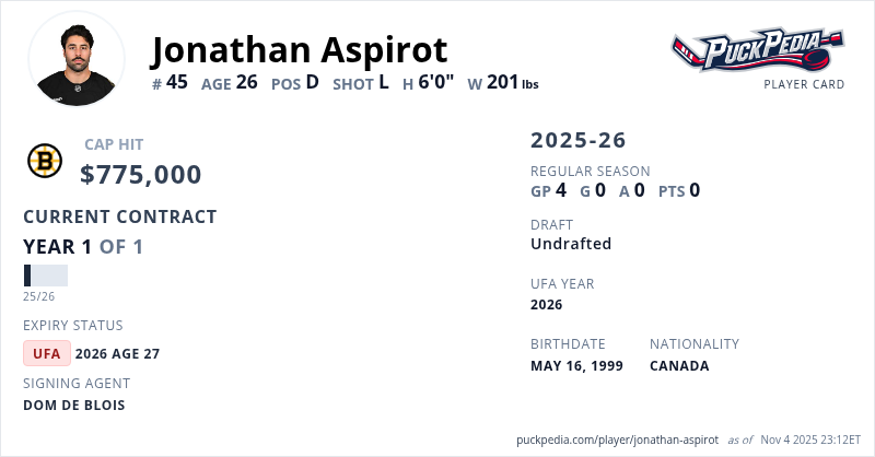Jonathan Aspirot is signed to a 1 year, $775,000 contract with a cap hit of $775,000 per season, playing for the Boston Bruins. His contract expires at the end of the 2025-26 season, making Aspirot an Unrestricted Free Agent.