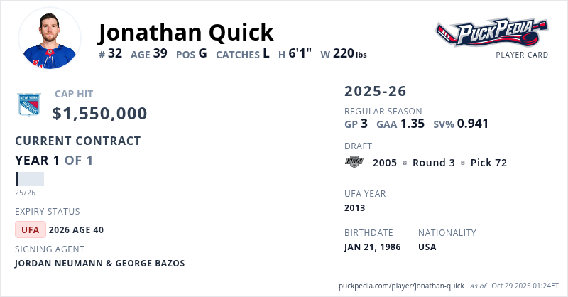 Jonathan Quick is signed to a 1 year, $1,550,000 contract with a cap hit of $1,550,000 per season, playing for the New York Rangers. His contract expires at the end of the 2025-26 season, making Quick an Unrestricted Free Agent.
