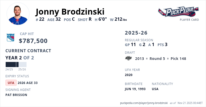Jonny Brodzinski is signed to a 2 year, $1,575,000 contract with a cap hit of $787,500 per season, playing for the New York Rangers. His contract expires at the end of the 2025-26 season, making Brodzinski an Unrestricted Free Agent.