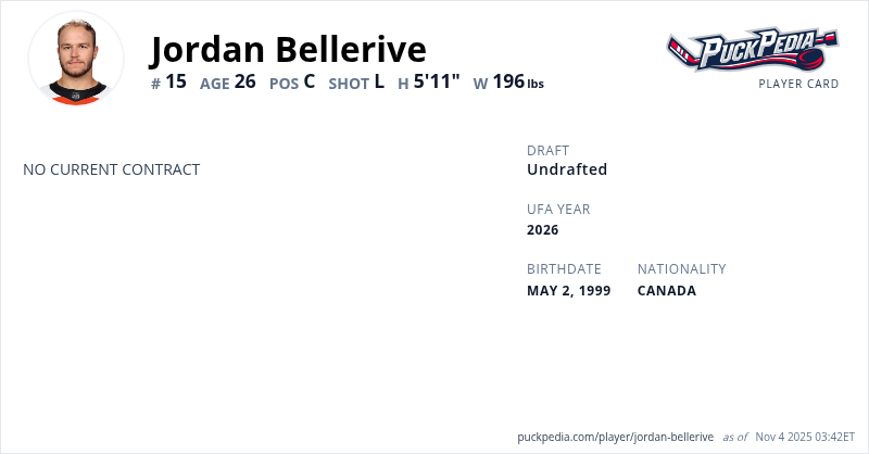 Jordan Bellerive is an Unrestricted Free Agent (No Qualifying Offer). His last contract was 3 years, $2,199,999 with a cap hit of $733,333 per season. It expired at the end of the 2021-22 season.