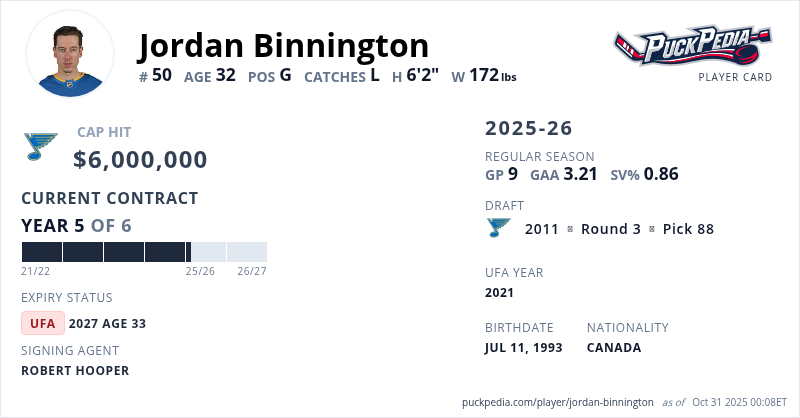 Jordan Binnington is signed to a 6 year, $36,000,000 contract with a cap hit of $6,000,000 per season, playing for the St. Louis Blues. His contract expires at the end of the 2026-27 season, making Binnington an Unrestricted Free Agent.