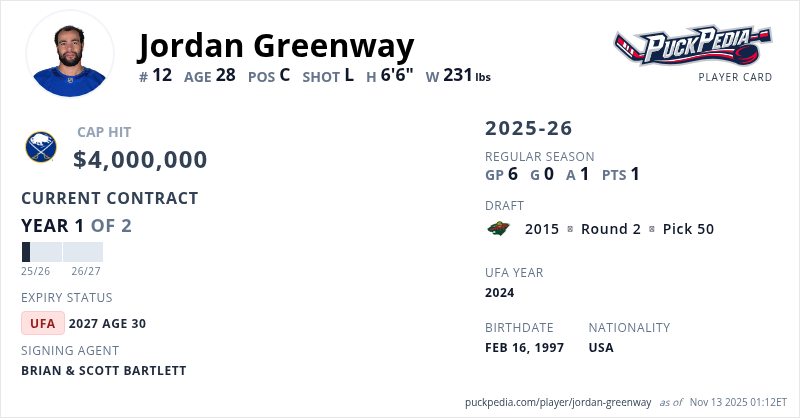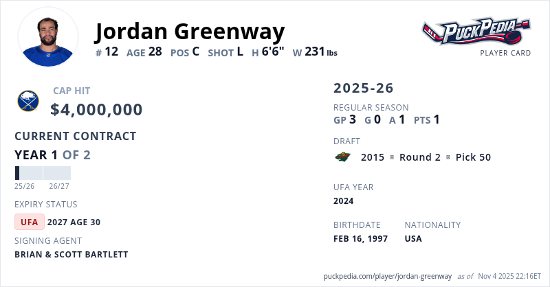 Jordan Greenway is signed to a 2 year, $8,000,000 contract with a cap hit of $4,000,000 per season, playing for the Buffalo Sabres. His contract expires at the end of the 2026-27 season, making Greenway an Unrestricted Free Agent.
