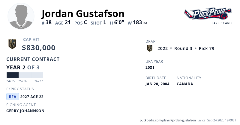 Jordan Gustafson is signed to a 3 year, $2,490,000 contract with a cap hit of $830,000 per season, playing for the Vegas Golden Knights. His contract expires at the end of the 2026-27 season, making Gustafson a Restricted Free Agent.