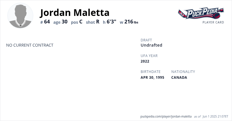 Jordan Maletta is an Unrestricted Free Agent. His last contract was 3 years, $2,377,500 with a cap hit of $792,500 per season. It expired at the end of the 2018-19 season.