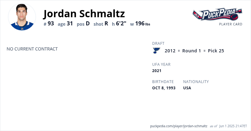 Jordan Schmaltz is an Unrestricted Free Agent. His last contract was 2 years, $1,400,000 with a cap hit of $700,000 per season. It expired at the end of the 2019-20 season.