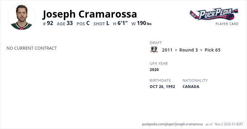 Joseph Cramarossa is an Unrestricted Free Agent. His last contract was 2 years, $1,500,000 with a cap hit of $750,000 per season. It expired at the end of the 2022-23 season.