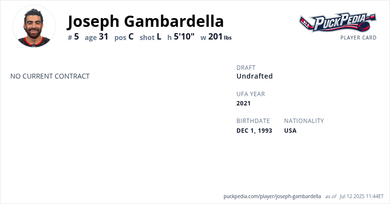 Joseph Gambardella is an Unrestricted Free Agent. His last contract was 2 years, $1,500,000 with a cap hit of $750,000 per season. It expired at the end of the 2022-23 season.