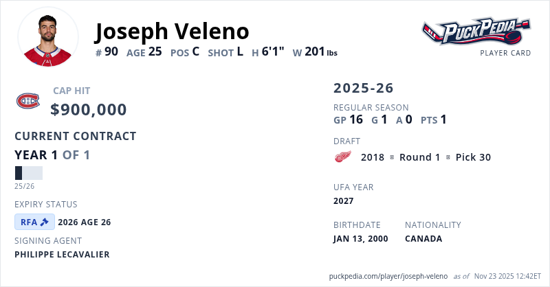 Joseph Veleno is signed to a 1 year, $900,000 contract with a cap hit of $900,000 per season, playing for the Montreal Canadiens. His contract expires at the end of the 2025-26 season, making Veleno a Restricted Free Agent.