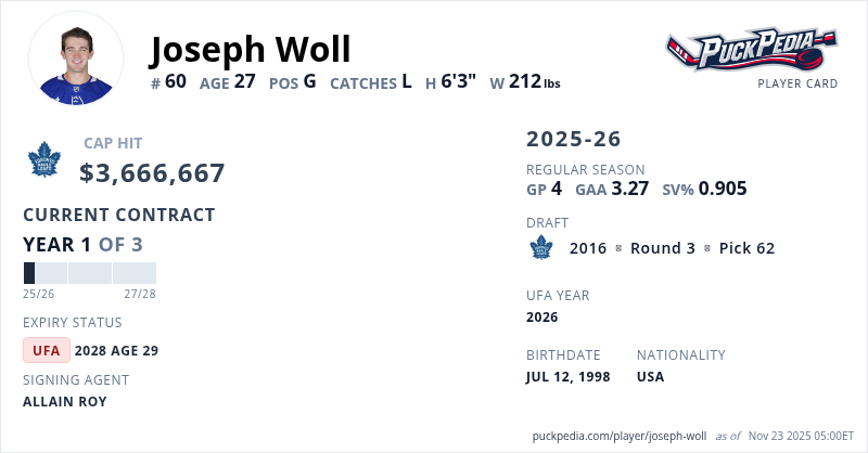 Joseph Woll is signed to a 3 year, $11,000,001 contract with a cap hit of $3,666,667 per season, playing for the Toronto Maple Leafs. His contract expires at the end of the 2027-28 season, making Woll an Unrestricted Free Agent.