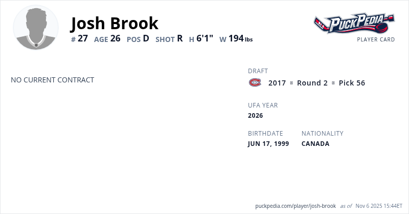 Josh Brook is an Unrestricted Free Agent (No Qualifying Offer). His last contract was 3 years, $2,385,000 with a cap hit of $795,000 per season. It expired at the end of the 2021-22 season.