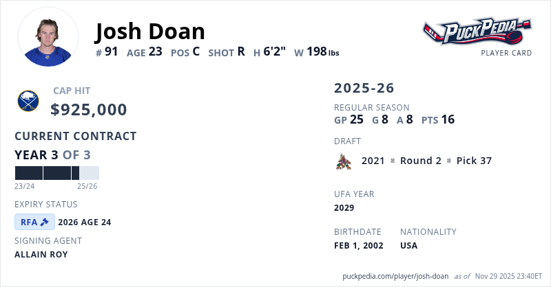 Josh Doan is signed to a 3 year, $2,775,000 contract with a cap hit of $925,000 per season, playing for the Buffalo Sabres. His contract expires at the end of the 2025-26 season, making Doan a Restricted Free Agent.