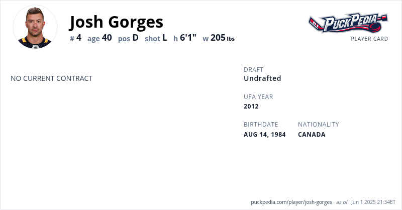 Josh Gorges is an Unrestricted Free Agent. His last contract was 6 years, $23,400,000 with a cap hit of $3,900,000 per season. It expired at the end of the 2017-18 season.