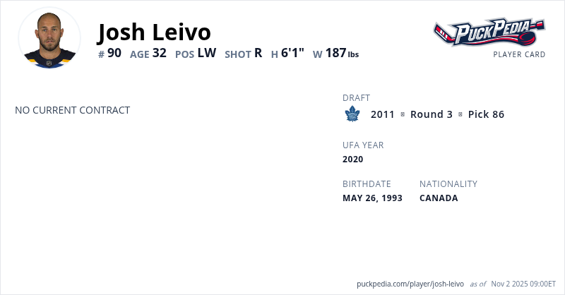 Josh Leivo is an Unrestricted Free Agent. His last contract was 1 year, $750,000 with a cap hit of $750,000 per season. It expired at the end of the 2022-23 season.