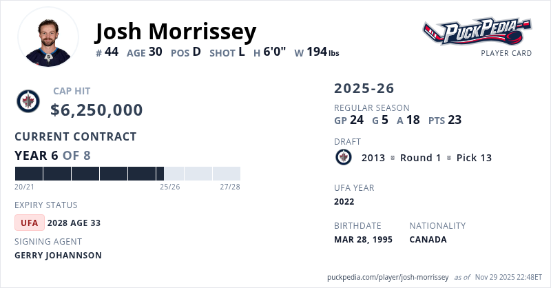 Josh Morrissey is signed to a 8 year, $50,000,000 contract with a cap hit of $6,250,000 per season, playing for the Winnipeg Jets. His contract expires at the end of the 2027-28 season, making Morrissey an Unrestricted Free Agent.