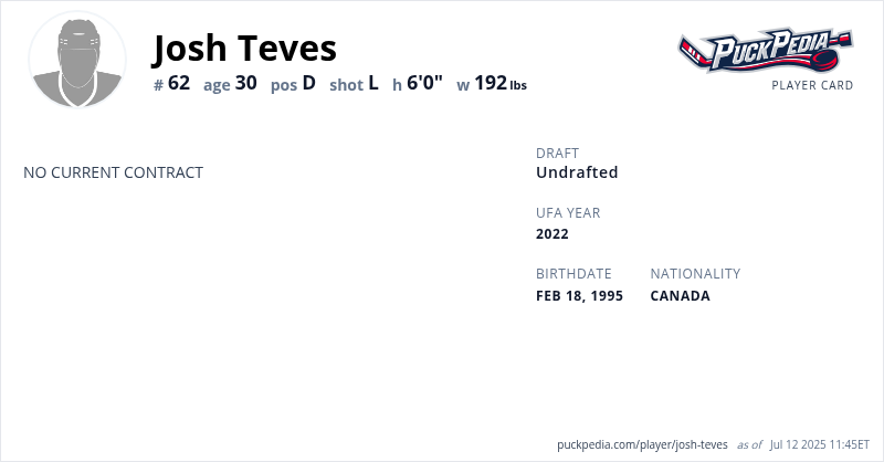 Josh Teves is an Unrestricted Free Agent. His last contract was 2 years, $1,400,000 with a cap hit of $700,000 per season. It expired at the end of the 2020-21 season.