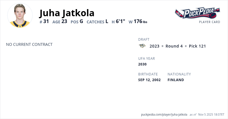 | 2022-23 | 20 | Liiga | KalPa | 40 | 2.16 | 0.903 | 0 | Playoffs | 3 | 1.01 | 0.943 | 0 | ||||||||||||||||||