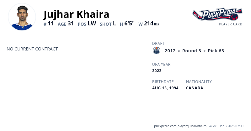 Jujhar Khaira is an Unrestricted Free Agent. His last contract was 1 year, $775,000 with a cap hit of $775,000 per season. It expired at the end of the 2023-24 season.