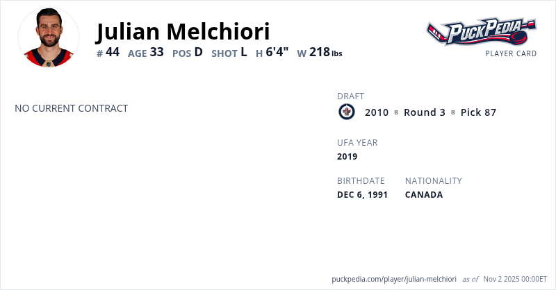 Julian Melchiori is an Unrestricted Free Agent. His last contract was 1 year, $700,000 with a cap hit of $700,000 per season. It expired at the end of the 2019-20 season.