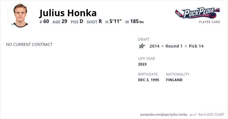 Julius Honka is an Unrestricted Free Agent (No Qualifying Offer). His last contract was 1 year, $700,000 with a cap hit of $700,000 per season. It expired at the end of the 2020-21 season.