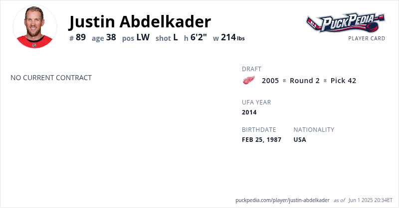Justin Abdelkader is an Unrestricted Free Agent. His last contract was 7 years, $29,750,000 with a cap hit of $4,250,000 per season. It expired at the end of the 2019-20 season.