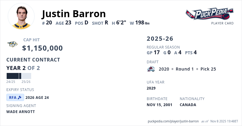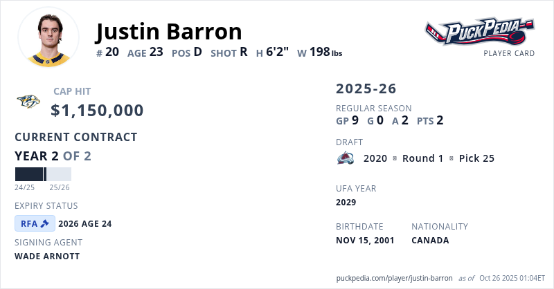 Justin Barron is signed to a 2 year, $2,300,000 contract with a cap hit of $1,150,000 per season, playing for the Nashville Predators. His contract expires at the end of the 2025-26 season, making Barron a Restricted Free Agent.