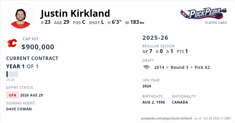 Justin Kirkland is signed to a 1 year, $900,000 contract with a cap hit of $900,000 per season, playing for the Calgary Flames. His contract expires at the end of the 2025-26 season, making Kirkland an Unrestricted Free Agent.