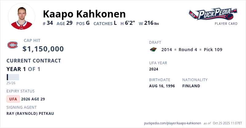 Kaapo Kahkonen is signed to a 1 year, $1,150,000 contract with a cap hit of $1,150,000 per season, playing for the Montreal Canadiens. His contract expires at the end of the 2025-26 season, making Kahkonen an Unrestricted Free Agent.
