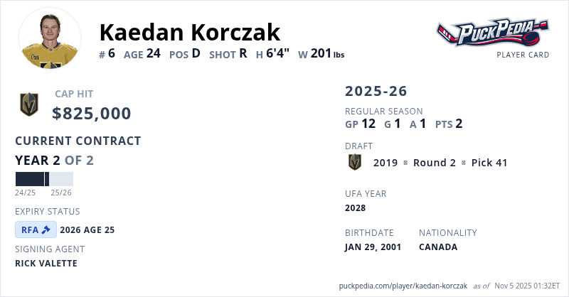 Kaedan Korczak is signed to a 4 year, $13,000,000 contract extension with a cap hit of $3,250,000 per season. He plays for the Vegas Golden Knights. His next contract begins for the 2026-27 season and expires at the end of the 2029-30 season, making him an Unrestricted Free Agent.