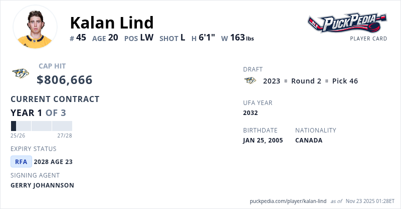 Kalan Lind is signed to a 3 year, $2,419,998 contract with a cap hit of $806,666 per season, playing for the Nashville Predators. His contract expires at the end of the 2027-28 season, making Lind a Restricted Free Agent.