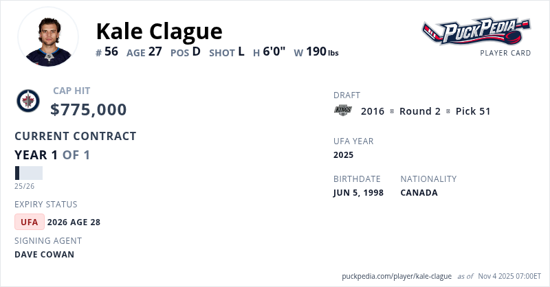Kale Clague is signed to a 1 year, $775,000 contract with a cap hit of $775,000 per season, playing for the Winnipeg Jets. His contract expires at the end of the 2025-26 season, making Clague an Unrestricted Free Agent.