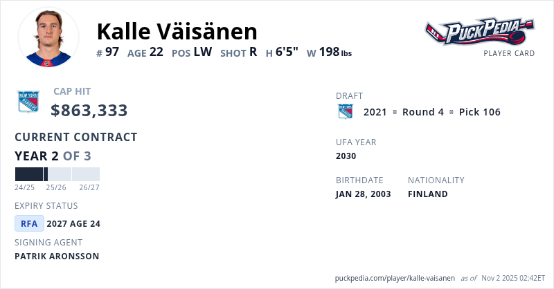 Kalle Väisänen is signed to a 3 year, $2,589,999 contract with a cap hit of $863,333 per season, playing for the New York Rangers. His contract expires at the end of the 2026-27 season, making Väisänen a Restricted Free Agent.