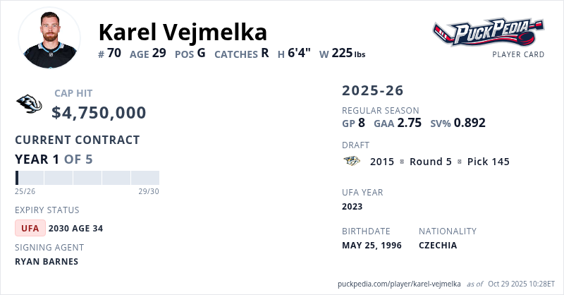 Karel Vejmelka is signed to a 5 year, $23,750,000 contract with a cap hit of $4,750,000 per season, playing for the Utah Mammoth. His contract expires at the end of the 2029-30 season, making Vejmelka an Unrestricted Free Agent.