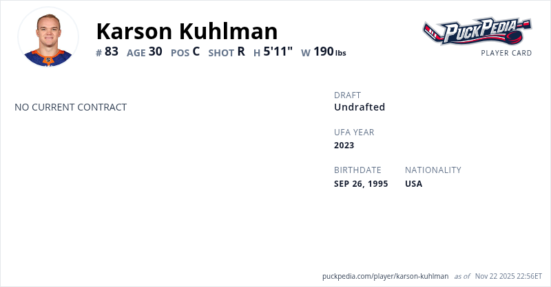 Karson Kuhlman is an Unrestricted Free Agent. His last contract was 1 year, $775,000 with a cap hit of $775,000 per season. It expired at the end of the 2023-24 season.