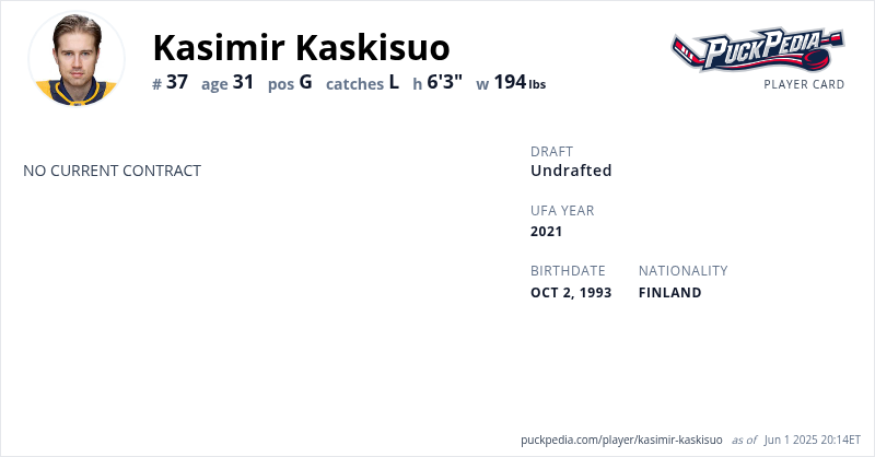 Kasimir Kaskisuo is an Unrestricted Free Agent. His last contract was 1 year, $700,000 with a cap hit of $700,000 per season. It expired at the end of the 2020-21 season.