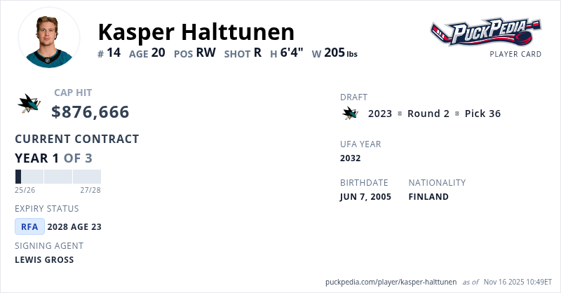 Kasper Halttunen is signed to a 3 year, $2,629,998 contract with a cap hit of $876,666 per season, playing for the San Jose Sharks. His contract expires at the end of the 2027-28 season, making Halttunen a Restricted Free Agent.